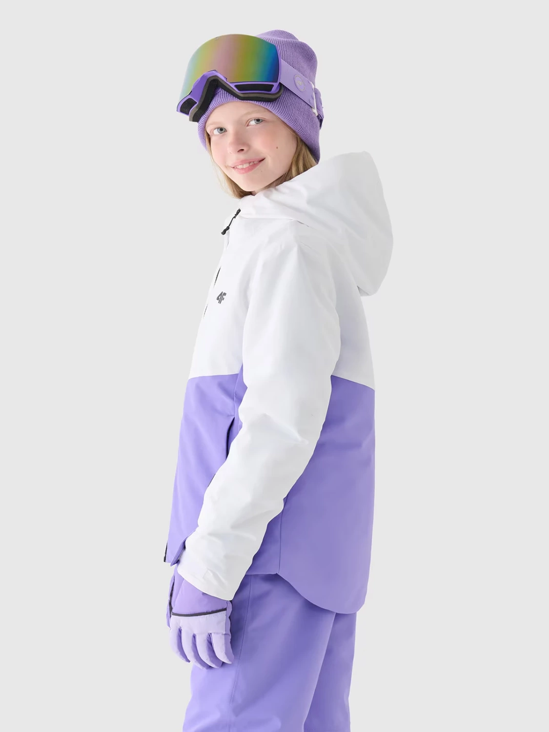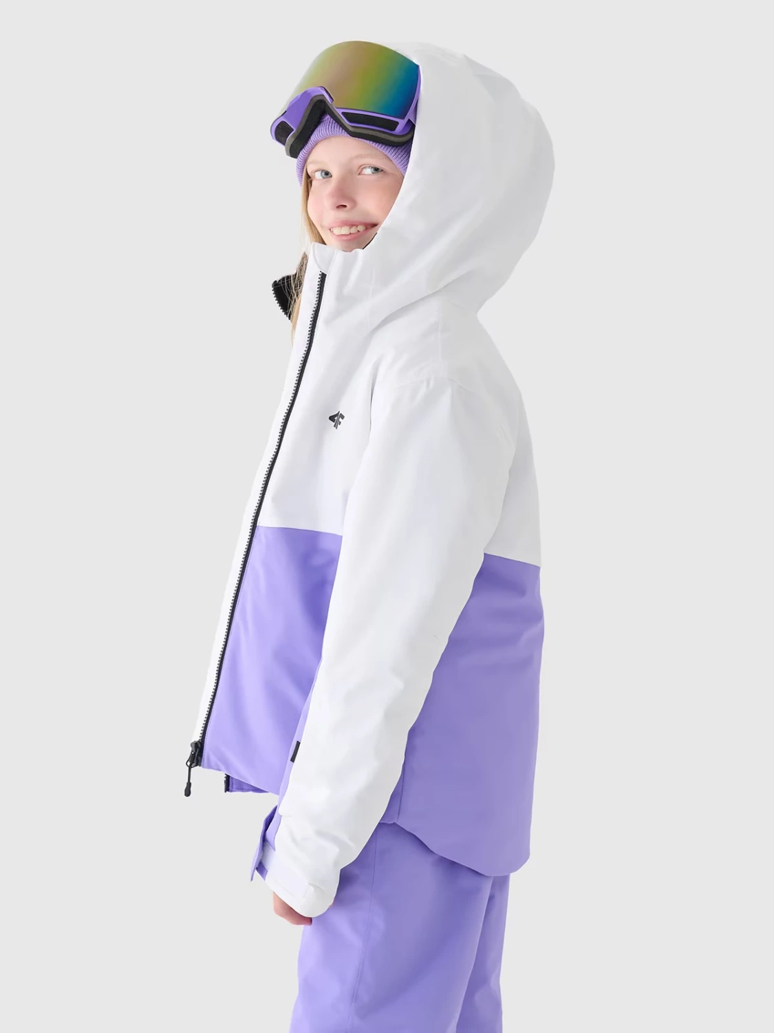Kurtka narciarska z kapturem dziewczęca technologicznie dostosowana do sportowych, umiarkowanych aktywności oraz codziennego zastosowania. Posiada krój regular, który wygodnie dopasowuje się do sylwetki oraz standardową długość sięgającą do linii bioder. Dzięki średniej objętości sprawdzi się podczas chłodniejszych dni.